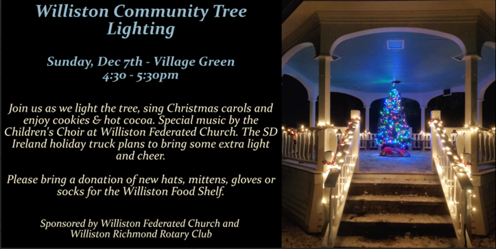 The Williston Community Tree Lighting will be held Sunday, December 7th 4:30-5:30pm on the Williston Village Green. We will light the tree, sing Christmas carols and enjoy cookies and hot cocoa. Our very own Children's Choir will provide special music and the SD Ireland holiday truck will bring some extra cheer. Please bring a donation of new hats, mittens, gloves or socks for the Williston Community Food Shelf